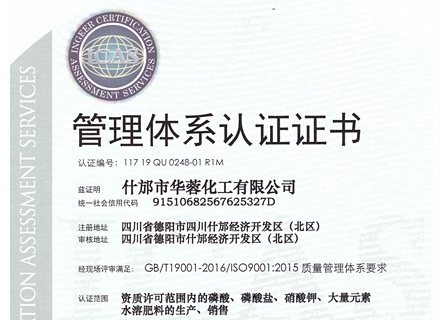 什邡市華蓉化工有限公司原名什邡華蓉科技有限責任公司,位于磷礦資源豐富的四川省什邡市,距成都60公里,交通運輸便利,是一家專業生產、研發精細磷化工系列產品的大型生產企業。生產設備先進,技術研發團隊強大,現公司占地面積約30000平方米,擁有5條生產線,主要生產大量元素水溶肥、磷酸二氫鉀、磷酸二氫銨、磷酸氫二銨、硝酸鉀、磷酸脲以及磷酸,年總產量為100000噸以上。公司資質齊全,管理規范,已取得安全生產許可證、ISO9001:2015質量管理體系認證、食品生產許可證、工業產品生產許可證、自營進出口經營權進出口證書以及出口歐盟國家部分產品的REACH證書。